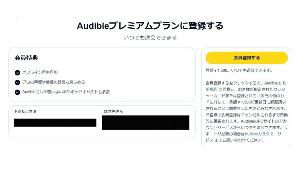 Audible公式サイトには「30日間の無料体験期間後、Audibleプレミアムプランは月額1,500円で自動更新されます。いつでもキャンセル可能です」と明記されており、無料期間中の解約で料金が発生しないことが保証されています。