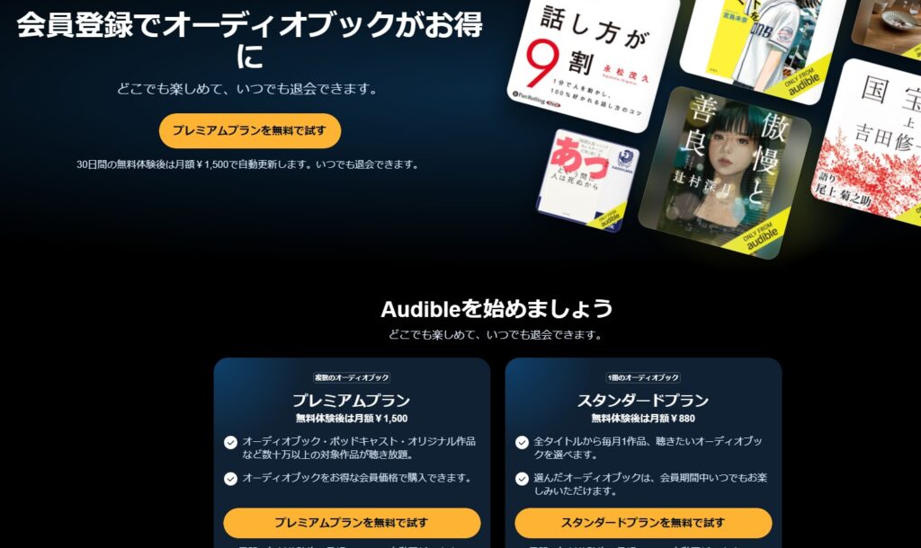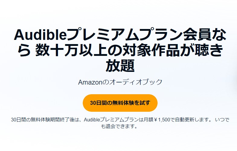 過去12ヶ月間に、Audible会員でなかった場合、または無料体験を利用していない場合は、30日間の無料体験付きプランに登録できます。